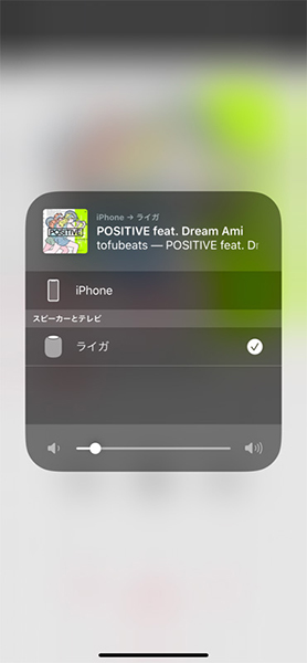 AirPlayのアイコンをタップするとHomePodが表示される。選択するとiPhoneで聴いていた音楽がHomePodから再生される