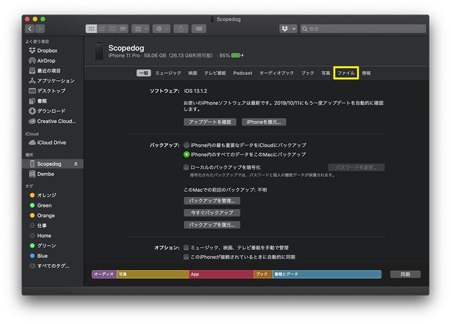 macOS CatalinaからはiPhoneにインストールしたアプリへのファイル転送はFinderで行う仕様に変更されたようだ。黄色い線で囲った「ファイル」メニューを選択する