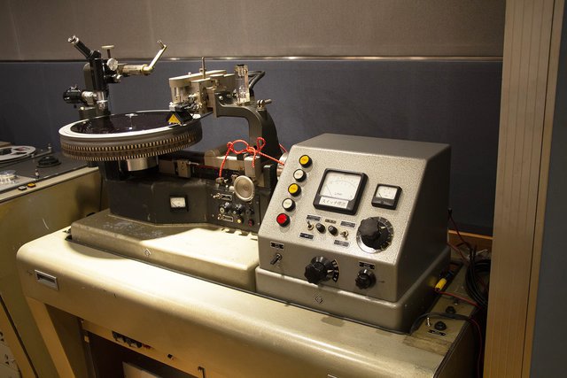 キング関口台スタジオで稼働するカッティングマシンVMS77。左の丸いところにラッカー盤が置かれ、針で音溝を削っていく