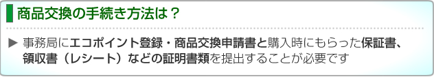 それではエコポイントと商品を交換するための手続きについて説明しましょう。商品交換には、住所や名前などを記入の上、貯めたエコポイントを登録し、交換したい希望の商品を選択する「(1)エコポイントの登録・商品交換申請」という手続きと、「(2)証明書類の郵送」を行う必要があります。