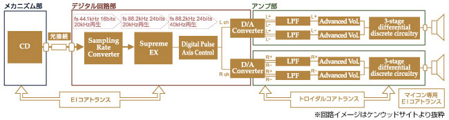 R-K1はCDプレーヤー、FM/AMチューナー、そしてプリメイン型アンプを一体化した製品で、安さと多機能が売りのセットものでは珍しくない形態だ。しかし音質重視の思想で貫かれた製品となると稀な存在になるだろう。R-K1の内部はCDメカニズム、アンプ部、デジタル処理部、電源部などを独立分離するように絶妙な位置関係で配置されている。その一環としてCDメカニズムは専用ケースに収めた外乱光遮断構造を採っている。さらにボトムのメカシャーシは下部にある電源トランスの電磁波の干渉も遮断している。またデジタル信号処理部に同社オリジナルの“Supreme EX”を搭載しているのも特徴だ。これはCDの作成過程でカットされてしまう20kHz以上の帯域を再生するための同社オリジナル技術であり、生楽器の持つ美しく繊細な響きやホールの空気感をリアルに引き出せる。その信号は定評ある英国Wolfson社のDACチップを左右独立で搭載、差動出力信号を生成。クリーンな音楽信号をアンプ部に伝送する。そのアンプ部は38W/ch(6Ω)という実用上十分なパワーを有している。フロントパネルはシンプルで機能的、大人の趣味の道具にふさわしい雰囲気を漂わせている。 ▼R-K1回路構成 R-K1と同時に開発されたスピーカーシステムLS-K1は、伝播速度の速いクロスカーボンと内部損失の高いパルプ素材を貼り合わせた新開発のハイブリッド・クロスカーボン振動板を採用した、12cm口径ウーファーを搭載したバスレフ型3ウェイ機。クロスオーバー周波数から考えると2ウェイ+スーパー・トゥイーターという構成にある。中高域は25mm口径ソフトドーム型トゥイーター、20mm口径のスーパー・トゥイーターを採用。これらは30mm厚バッフル内の独立したキャビティに取り付けられている。エンクロージャーは高密度MDFを採用、表面は美しい木目のサテンシカモア材の突き板仕上げを施すなど価格以上の性能と高級感を実現している。