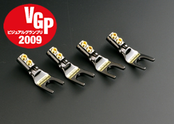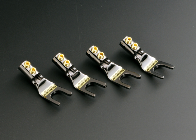 【Yラグ端子】SPY-4RU 端末処理はケーブルの大きな問題のひとつだが、接触面積だけでなく金属どうしの整合性にも関係があるという。従来の素材ではその不整合によって量子ノイズが生じ、それがヒステリックな音調の基となっていたというのがオーディオリプラスの主張で、このため接点にルテニウムによる特殊プレーティングを行ったのがこのYラグである。 基材はOFCの削り出しで、ウルトラSZ物性処理も施されている。導体の固定は六角スクリューによる2点式。絶縁用のヒートシュリンクと六角レンチも付属する。レンジが広がり暴れがなくなって鮮やかな音調だ。背景ノイズも静かになったように感じられる。ジャズのベースやドラムが明確になり、トロンボーンはシャープでしかも棘がない。アカペラは滑らかで肉質感にも富み、余韻の透明度が上がる。意外なほどの改善効果である。(文/井上千岳)