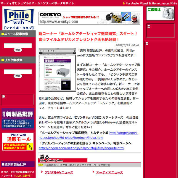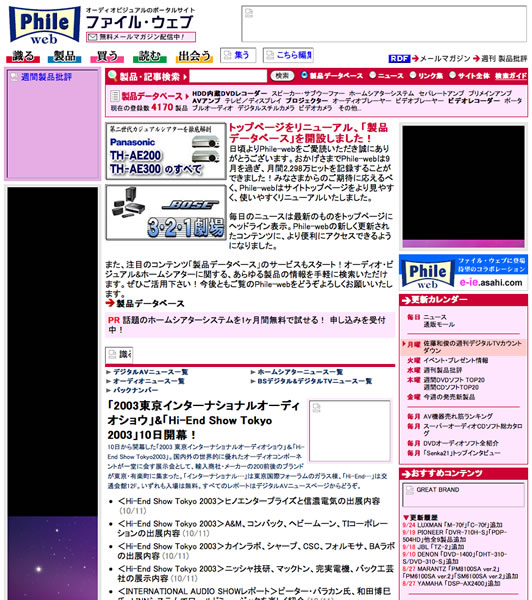 【Phile-webのできごと】サイト開設から1年が経った7月、アクセス数の急増に伴い、ホームシアターファイルのウェブ版という位置づけから、AV/ホームシアター/オーディオすべての情報を取り扱う独立した編集部として本格的に運営を開始しました。同時にニュースのバックナンバー開放、検索機能などを実装。さらに使い勝手を高めました。また音元出版刊行雑誌の通販サービスも同時に立ち上げ、販売数量は現在に至るまで年々増え続けています。