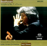| 曲名/その他 | ベートーヴェン 交響曲 第9番 ニ短調 作品125《合唱》 アンネ・シュヴァーネヴィルムス(ソプラノ)、バーバラ・ディヴァー(アルト)、ポール・グローヴズ(テノール)、フランツ・ハヴラタ(バス)、東京オペラシンガーズ、サイトウ・キネン・オーケストラ、指揮:小澤征爾 録音:2002年9月5‐9日 長野県松本文化会館(ライヴ)〈デジタル録音〉 日本の音楽教育史上の重鎮故・齋藤秀雄に教えを受け世界各地で活躍している音楽家たちが、恩師齋藤の没後10年(1984年)に「齋藤秀雄メモリアル・コンサート」を開催するために日本に集まった。"奇跡のオーケストラ""幻のオーケストラ"と絶賛を博し、その水準の高さに世界が魅了された。このコンサートが礎となり「サイトウ・キネン・オーケストラ」が誕生し、1992年に第1回「サイトウ・キネン・フェスティバル松本」が開催。以来松本での音楽祭を中心に、海外公演も含めて様々な活動を行っており、質の高い演奏でファンを魅了してきた。世界各地で活躍する日本の音楽家の集団__いわば「オール・ジャパン・メンバー」とも言える集団、それがサイトウ・キネン・オーケストラである。中でも小澤征爾は中心的存在として常にサイトウ・キネンを引っ張ってきた。「松本から世界に向けて新しい感動を発信する」__そんな国際的音楽祭を地方都市で根付かせられたのも、小澤征爾という世界的指揮者がいたからこそ実現したのである。 |