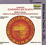 | 曲名/その他 | オルフ:カルミナ・ブラーナ ジュディス・ブレゲン(ソプラノ)、ホーカン・ハーゲゴール(バリトン)、ウィリアム・ブラウン(テノール)、アトランタ少年合唱団 アトランタ交響楽団・合唱団、指揮:ロバート・ショウ 録音:1980年11月16_18日アトランタ、メモリアル・アーツ・センター、シンフォニー・ホール〈デジタル録音〉 |