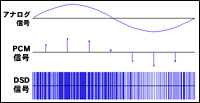 | DSD方式では、アナログ入力波形がプラスになればなる程パルス密度が高くなり、マイナスになるほど低くなる。 |