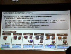 多くのPCメーカーのなかでも、早くからサウンド機能の強化に取り組んできたのがNECだ。2009年秋冬に発売されたVALUESTAR VWシリーズを皮切りに、ヤマハ製オーディオシステムを搭載した。