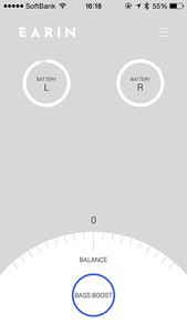 続いて専用アプリを使ってみた。左右イヤーチップのバッテリー残量確認/左右の音量バランス/ベースブーストだけというシンプルなつくり。ベースブーストを使うと低音に厚みが増すが、ややこもったような音になるので好みが分かれそうだ。