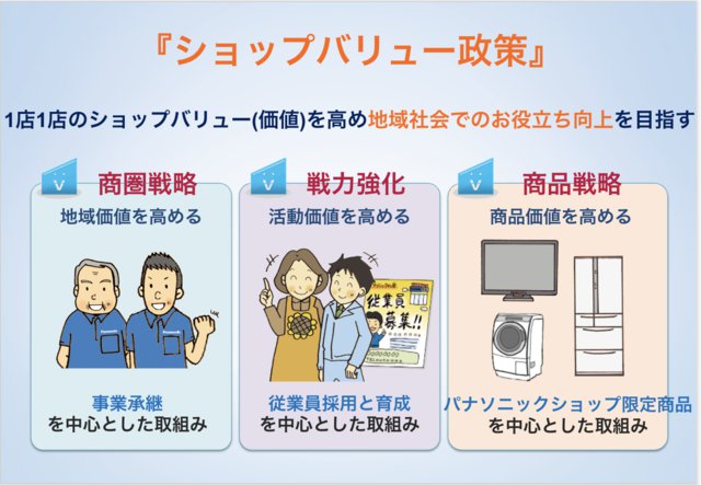 地域専門店販売網の中で大きな課題となっていたお店の減少、顧客の減少といった負のサイクルは底を打った。増客が実績として出ています。お店の戦力が強化され、お客様へのお役立ちが進む。冷蔵庫、エアコン、洗濯機、テレビといった大型商品に、小物商品、住宅、リフォーム、創蓄連携の商品、さらにまったく新たな商材により、お客様へのお役立ちの幅が広がる。地域専門店販売網を活性化し、そこに商品やサービスを提供することでお客様へのお役立ちを活発にします。「ショップバリュー政策」は手を緩めずに推進しなければなりません。