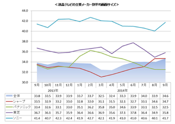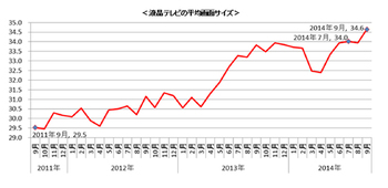 BCNは、同社が行っている全国主要家電量販店等の実売データを集計する「BCNランキング」の調査結果にて、2014年9月に国内販売された液晶テレビの平均サイズが「34.6」と過去最大を大きく更新したことを発表した。