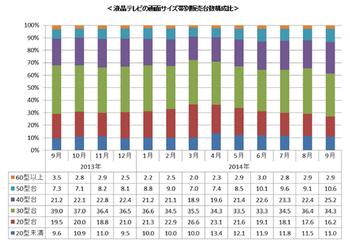 この1年の画面サイズ帯別販売台数構成比では、40型台が大きく伸びており、9月には25.2%に達した。また50型モデルも10.6%と1割超えに。一方30型台はじりじりと後退し、昨年比4.7%減の34.7%となっている。