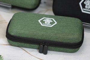 上掲のメッシュポーチも収納が可能。本体外装は、MUSIN君ケース1号でもお馴染みの汚れが目立ちにくいファブリック素材を採用した。カラーバリエーションはファブリックブラック、リーフグリーンの2色を展開する。外寸は210×120×55mm、内寸(片側)は190×100×20mmとなる。