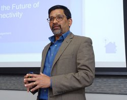 Qualcomm Technologiesのプロダクトマネージメント部門バイス・プレジデントのゴピ・シリネニ氏は、宅内の無線通信品質を高速化・低遅延化・安定化させるための「5G対応CPE(ユーザー宅内機器)」と「Wi-Fiメッシュネットワーク」の技術を中心に紹介した。