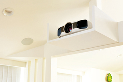 プロジェクターに選んだのは設置性に優れたエプソンの「EH-TW8000」。イーストンの100インチのサウンドスクリーンに投影している。EH-TW8000は梁を活かして設けた置き台に設置。置き台は空間にあわせてデザインされている。