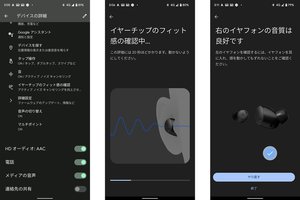 リスニングを始める前に、Android 6.0以上のスマホと組み合わせた場合に利用できる「イヤーチップのフィット感の確認」を済ませた。グーグル独自のアルゴリズムによる「Silent Seal(サイレントシール)」技術でノイズキャンセリング効果を最大化するためにも、ユーザーの耳の形に合ったイヤーチップを選び、イヤホンが正しく耳に装着できているかを確認しておきたい。