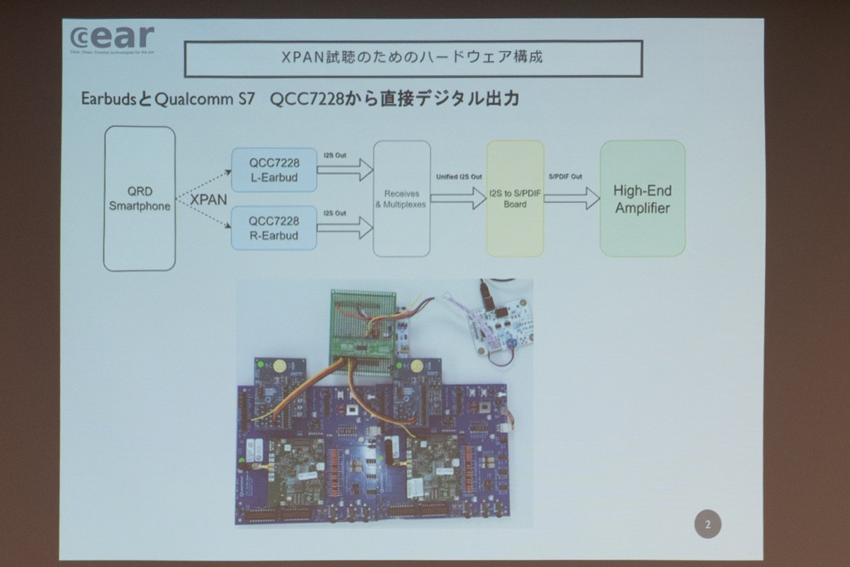 Qualcomm XPANの試聴システムに用いられたのは、本邦初公開だというQualcomm XPAN受信対応の評価ボード。スマートフォンからQualcomm XPANや従来のBluetooth(Qualcomm (R) aptX TM Lossless/SBCコーデック)で受信したオーディオ信号を、デジタル端子から出力することができるものだ。もともと完全ワイヤレスイヤホンを想定して作られているためL/Rchそれぞれ1枚ずつに分かれており、2枚を結合することでステレオ再生に対応させている。