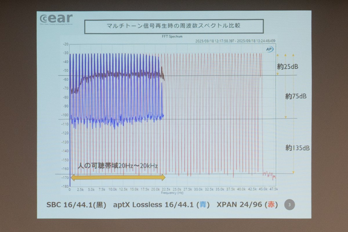 村山氏が解説のためスライドに映したのは、オーディオや通信の測定試験で用いられるマルチトーン信号を、Qualcomm XPAN(96kHz/24bit)/Qualcomm (R) aptX TM Lossless(44.1kHz/16bit)/SBCのそれぞれで送受信した測定結果。各コーデックで伝送されたオーディオ信号を再生すると、どのような周波数スペクトルが得られるのかをグラフに表したものだ。