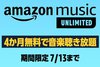 Amazon Music Unlimited、いまなら4か月無料。7月13日までの期間限定キャンペーン